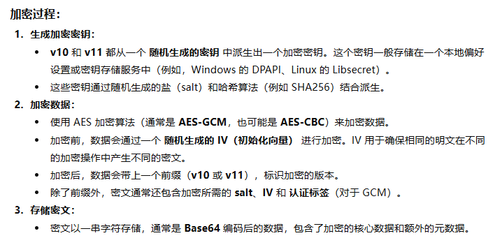 将加密算法改为AES-256-GCM ,同时对密钥套了一层DPAPI,encrypted_key位于Local State中,密文以v10/v11开头