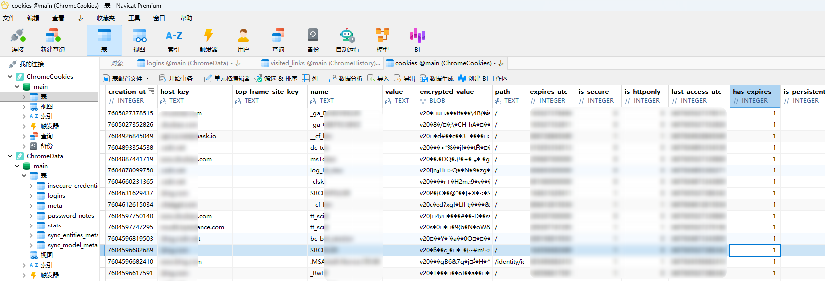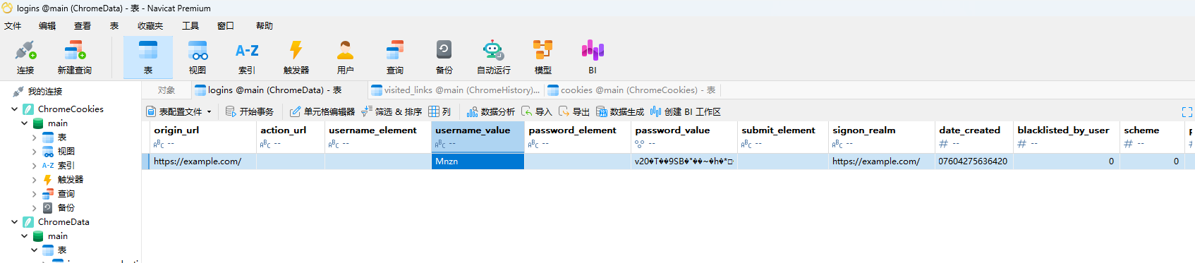 chromiumUserDataPath = homeDir + "/AppData/Local/Chromium/User Data/Default/"密码、历史记录、Cookies分别以sqlite形式存储在目录下的Login Data 、History、Network\Cookies文件,但Cookies与LoginData被加密,History可直接读取