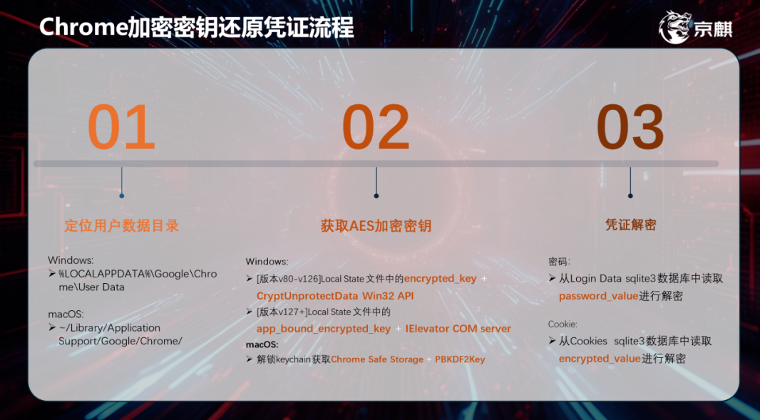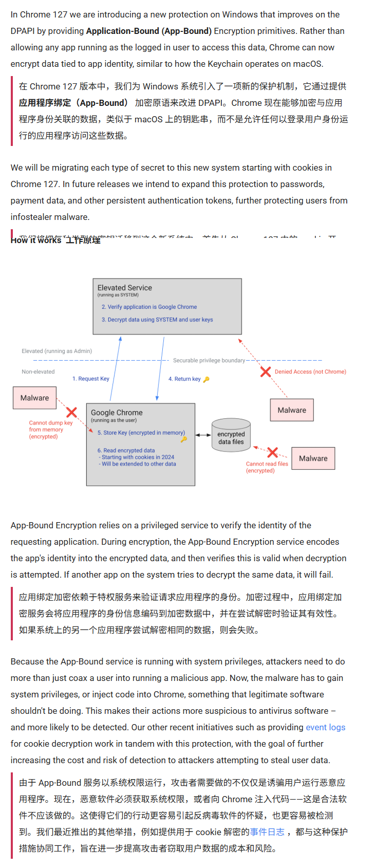 Chrome 对解密进行了进一步的ABE(App-Bound-Encryptio)处理,新增了app_bound_encrypted_key,密文以v20开头,同时添加了一系列的防盗措施