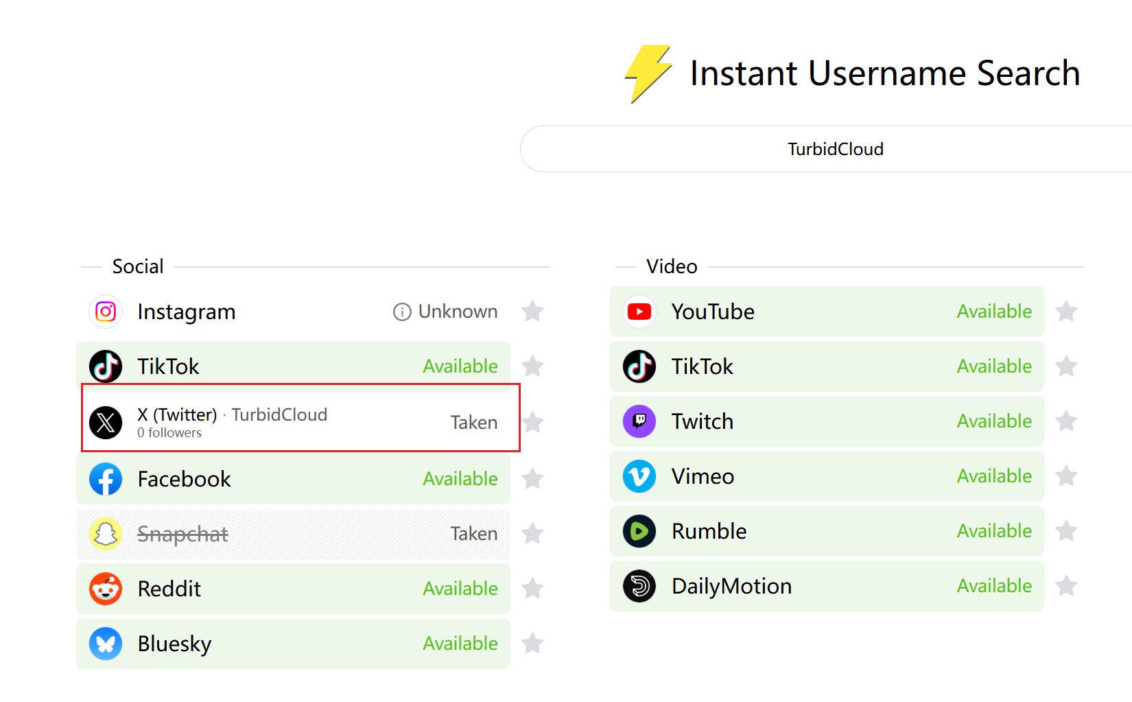 更离谱的是,居然还有人根据这个名字在另一个平台找到了我的账号,然后给我发了消息。虽然内容也只是随便说认出了这个名字,但还是让人感觉有点不太舒服。”思路转向在 namemc 查到的曾用名,尝试 TurbidCloud,使用 https://instantusername.com/ 来检索其他社媒,检索到了Twitter