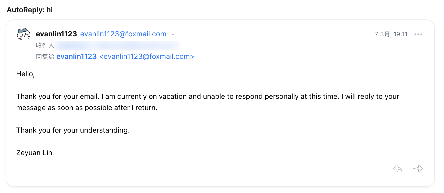 通过博客中信息了解邮箱设置了自动回复及 @foxmail.com 的邮箱域名