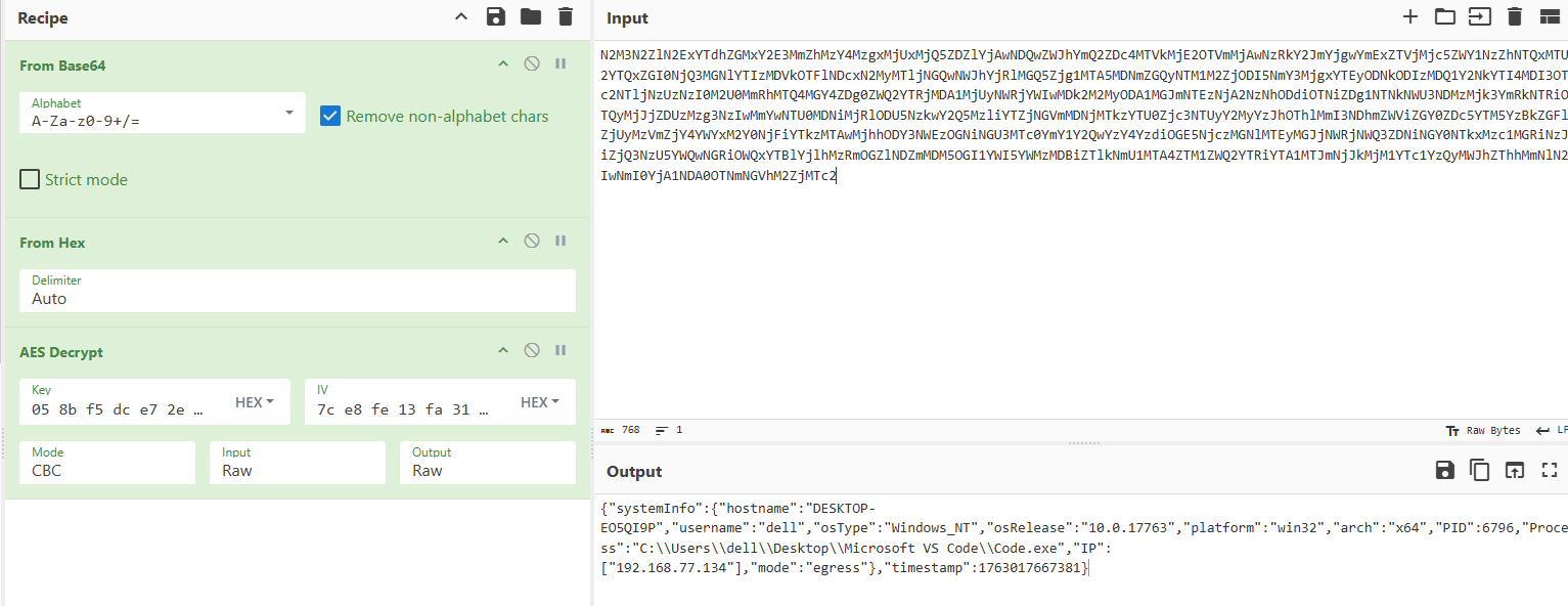 {"systemInfo":{"hostname":"DESKTOP-EO5QI9P","username":"dell","osType":"Windows_NT","osRelease":"10.0.17763","platform":"win32","arch":"x64","PID":4424,"Process":"C:\\Users\\dell\\Desktop\\Microsoft VS Code\\Code.exe","IP":["192.168.77.140"],"mode":"egress"},"timestamp":1763185526894,"signature":"crCZOGosG07B43yK1t5Jw+CMxgA/tRc7MNE14SRiYJM="}
